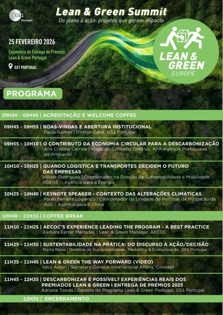A cerimónia de entrega de prémios do programa Lean & Green em Portugal é um momento anual de reconhecimento público pela GS1 Portugal das empresas que se distinguem pelo seu compromisso com a descarbonização da cadeia logística e de transporte, no âmbito do programa Lean & Green.